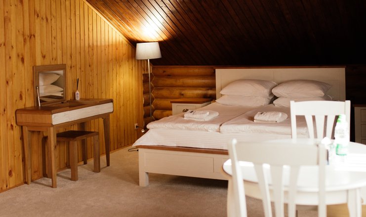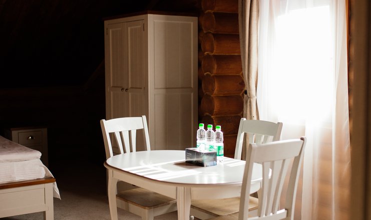 В номере: кровати односпальные: 2 шт., дополнительные, кровать двуспальная: 2 шт., прикроватные тумбочки, стол, стулья, шкаф, Оборудование, набор посуды, холодильник, чайный набор посуды, электрочайник