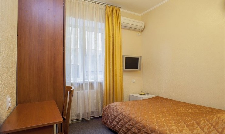 В номере: две односпальные кровати, прикроватные тумбочки, стол, стул, шкаф, кондиционер, набор посуды, телевизор, телефон, холодильник