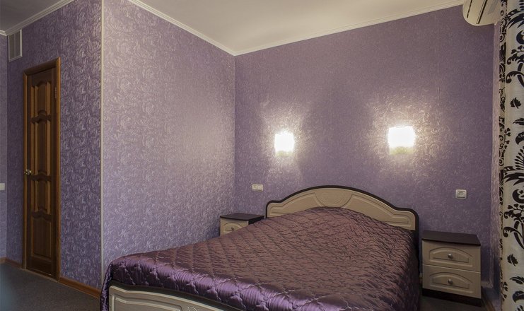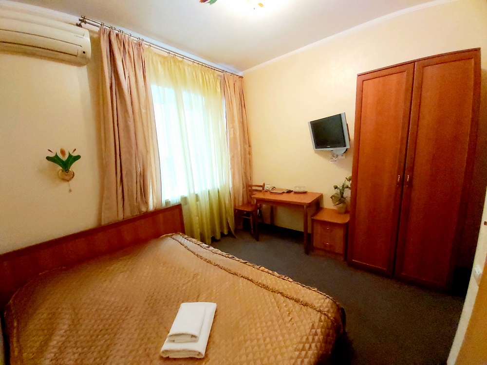 В номере: кровать двуспальная, прикроватные тумбочки, стол, стул, шкаф, кондиционер, набор посуды, телевизор, телефон, холодильник